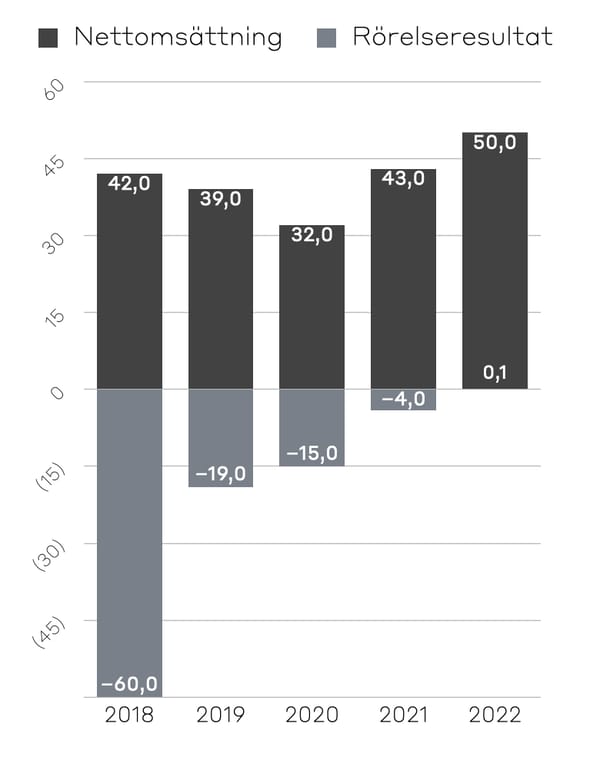 Grafen visar Waykes utveckling från första hela året efter lansering fram till årsskiftet 2022. Fokuseringen mot lönsam tillväxt har gett resultat vilket grafen bekräftar. Wayke har lyckats skapa tillväxt de senaste åren samtidigt som rörelseresultatet har förbättrats avsevärt.