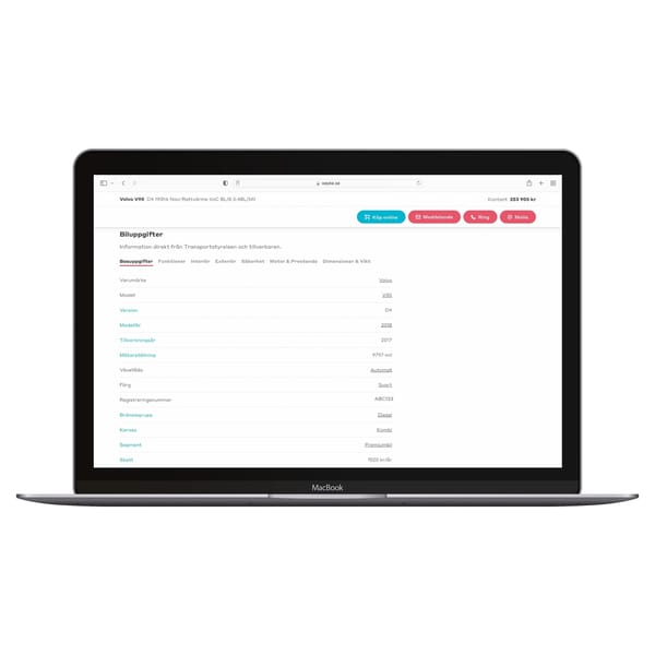 Alla fordon som publiceras via Wayke berikas med relevant och validerad information. Vi berikar varje objekt med upp till 250 datapunkter för att konsumenten ska få en så transparent bild som möjligt av objektet. Vi har valt ut massor med bra information som vi anser är väsentliga för köparen, bland annat modellår, mätarställning, färg, växellåda, bränslegrupp osv. Vi hämtar information från bildatabasen car.info, respektive tillverkare och Transportstyrelsen.